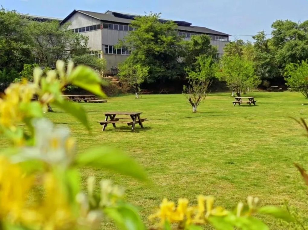 在這里,有山有水,是逃離城市帶來的舒緩與愜意。那一灣湖水,恰似園區(qū)的眼眸,波光粼粼,顧盼生輝。湖光與山色相互繾綣,岸邊的青蔥樹木高低錯落,倒映在水中,隨著水波搖曳,虛實(shí)交錯,仿佛一幅水墨丹青。