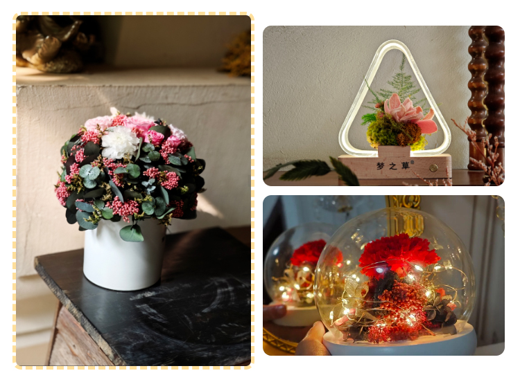 選取各類植物制成的生態(tài)永生花,DIY屬于自己的奇思妙想,永生花相框、小花束、小臺燈……只要你夠有創(chuàng)造力,你將用永生花完成各種精美設(shè)計!